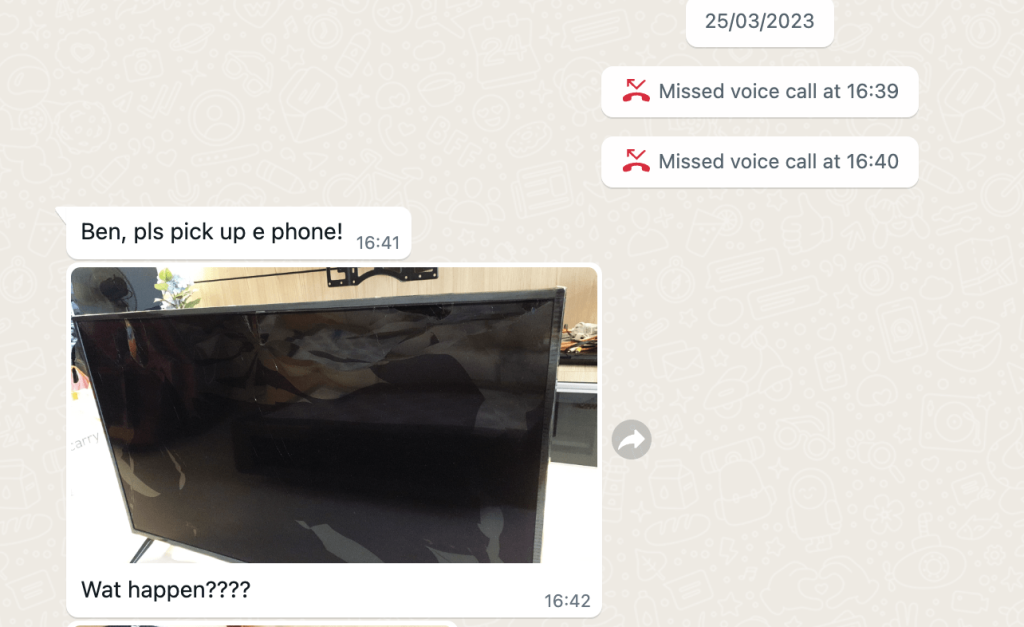 Miss Rashidah, contacted us 15 days (2 WEEKS) after the move out/handover and informed us there’s a crack on the TV even with additional packing, we gladly responded to look into it within 2-3mins