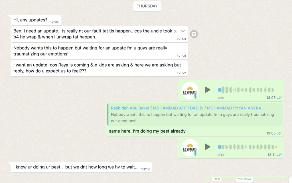 Whilst we understand that certain situation are easy to be leveraged on, we’ve tried our best to resolve this case within our means. and we’ve advise Miss Rashidah to go ahead to make a Small Claim against us so we can better resolve this situation with a mediator .